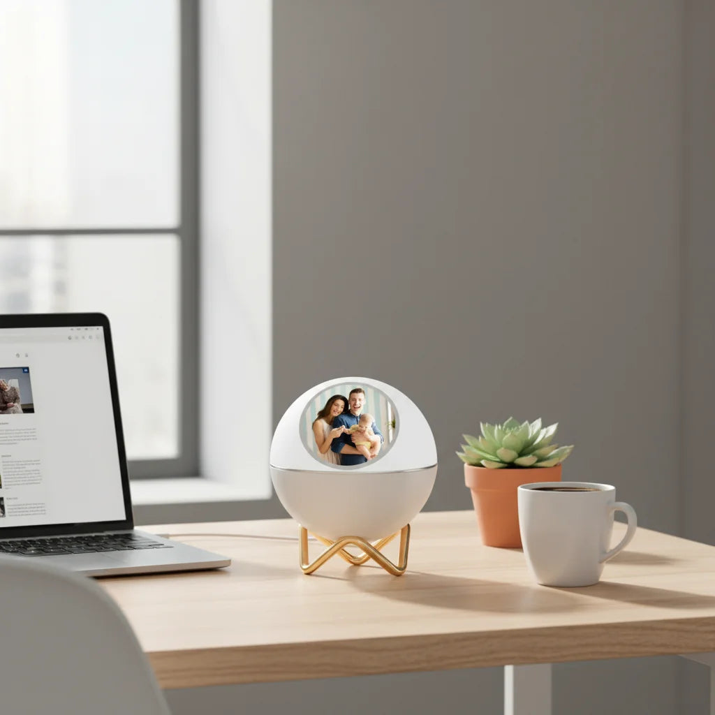 Transforma tus recuerdos más preciados en una esfera luminosa. Cada VideoGlow™ es único, diseñado por ti para celebrar el amor, la familia o ese momento especial que quieres revivir siempre.